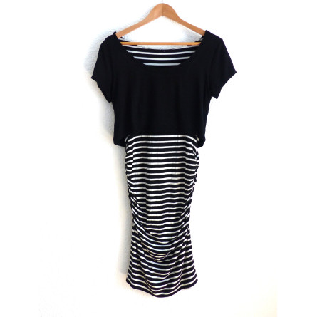 Une robe confortable qui vous accompagnera tout au long de votre grossesse. De marque ENVIE DE FRAISE, de couleur noire et crème à rayures, son tissu doux et sa coupe classique et délicate apporteront à la future maman le confort nécessaire. Hauteur: 100 cm