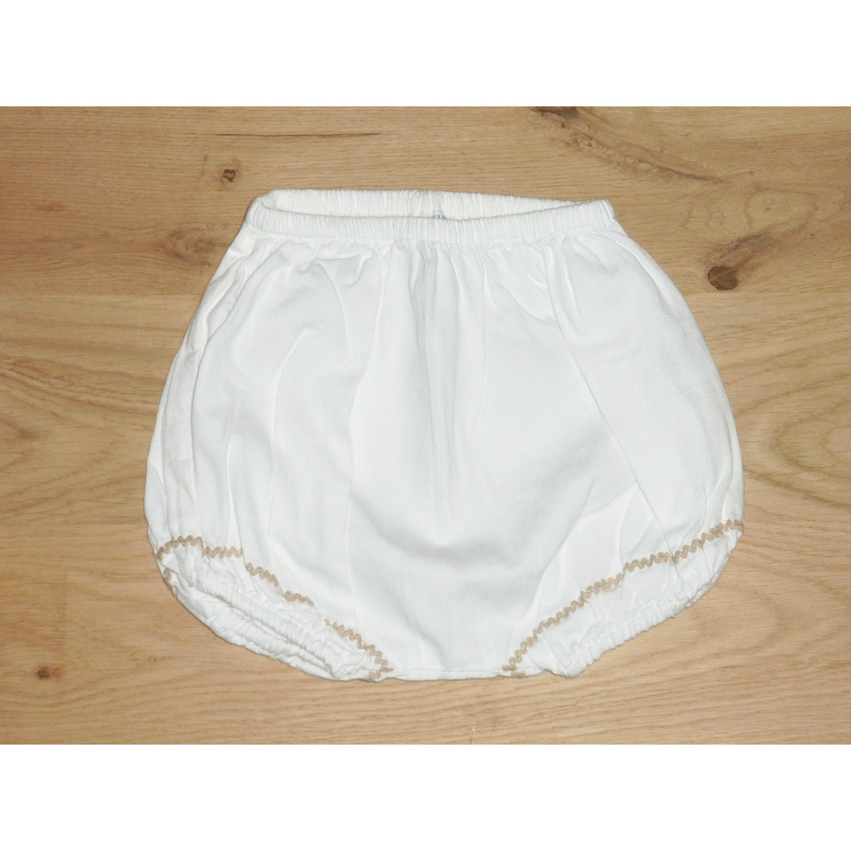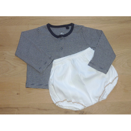 Ensemble en excellent état, de marque PETIT BATEAU, composé d'un bloomer blanc en velours finement côtelé orné d'un liseré brodé couleur nougat. Ceinture élastique. Associé au gilet rayé marine en coton.