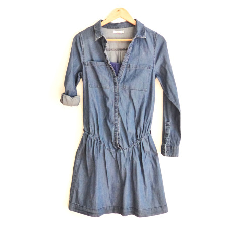 Une robe confortable qui vous accompagnera tout au long de votre grossesse. De marque VERT BAUDET, en denim souple couleur bleue. Son tissu doux et sa coupe classique et délicate apporteront à la future maman le confort nécessaire. Débardeur intégré afin de faciliter l'allaitement. Hauteur: 90 cm