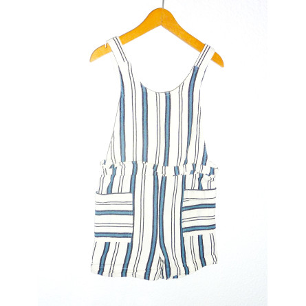 Salopette courte, avec 2 petites poches, beige à rayures de couleur bleu. 100% coton bio, excellent état. Modèle mixte. Craquage complet pour ce look casual chic !