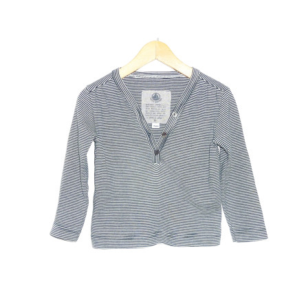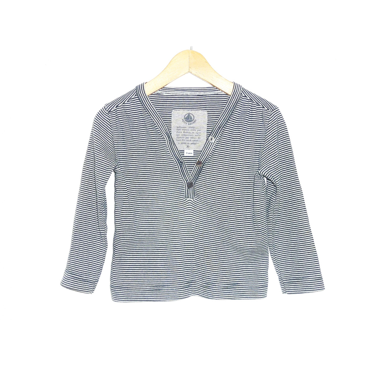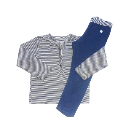 Ensemble mixte de marque Petit Bateau en excellent état, composé d'un legging bleu brut avec ceinture rayé et associa au haut marine et crème rayé. En coton, gamme milleraies iconique de la marque.
