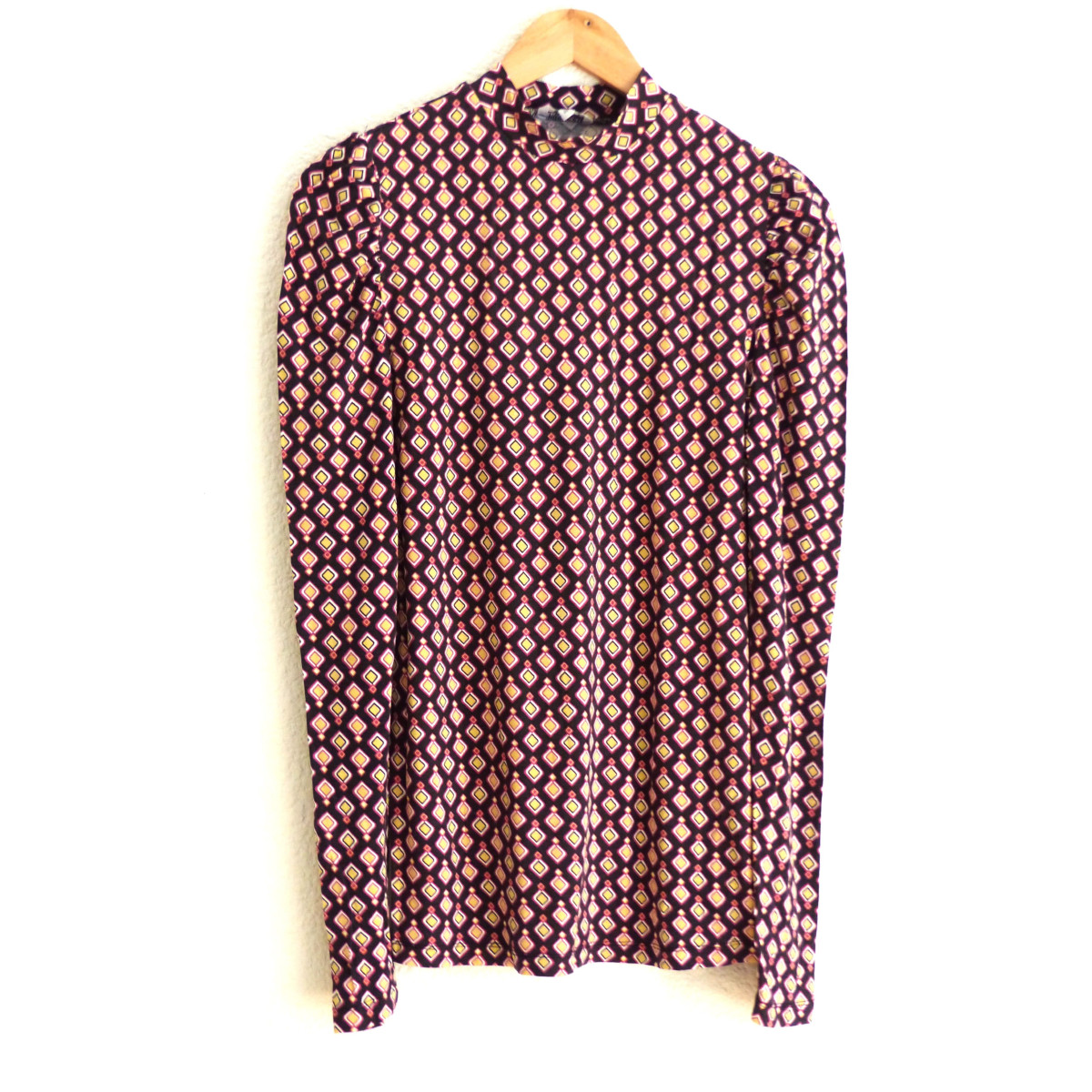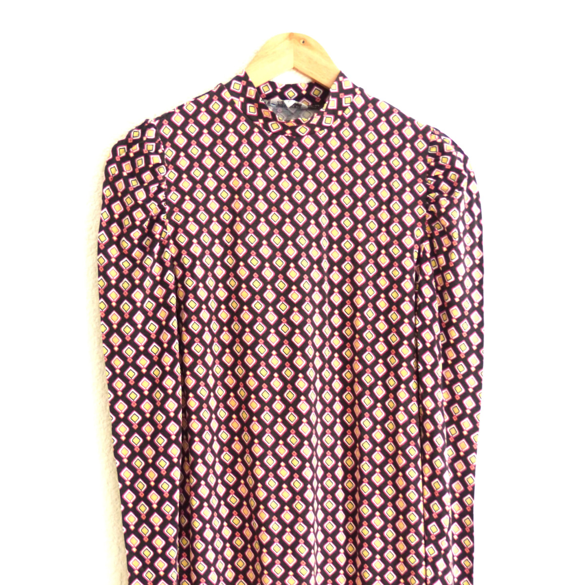 Un haut confortable qui vous accompagnera tout au long de votre grossesse. De marque PRENATAL, ornée d'un col montant et d'épaules bouffantes. Imprimé à l'inspiration seventies, couleur chocolat / moutarde et fushia.
