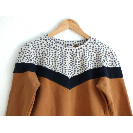 Un sweat confortable qui vous accompagnera tout au long de votre grossesse. De marque PRENATAL, doublé, en coton organic. Couleur cognac orné d'un imprimé graou.