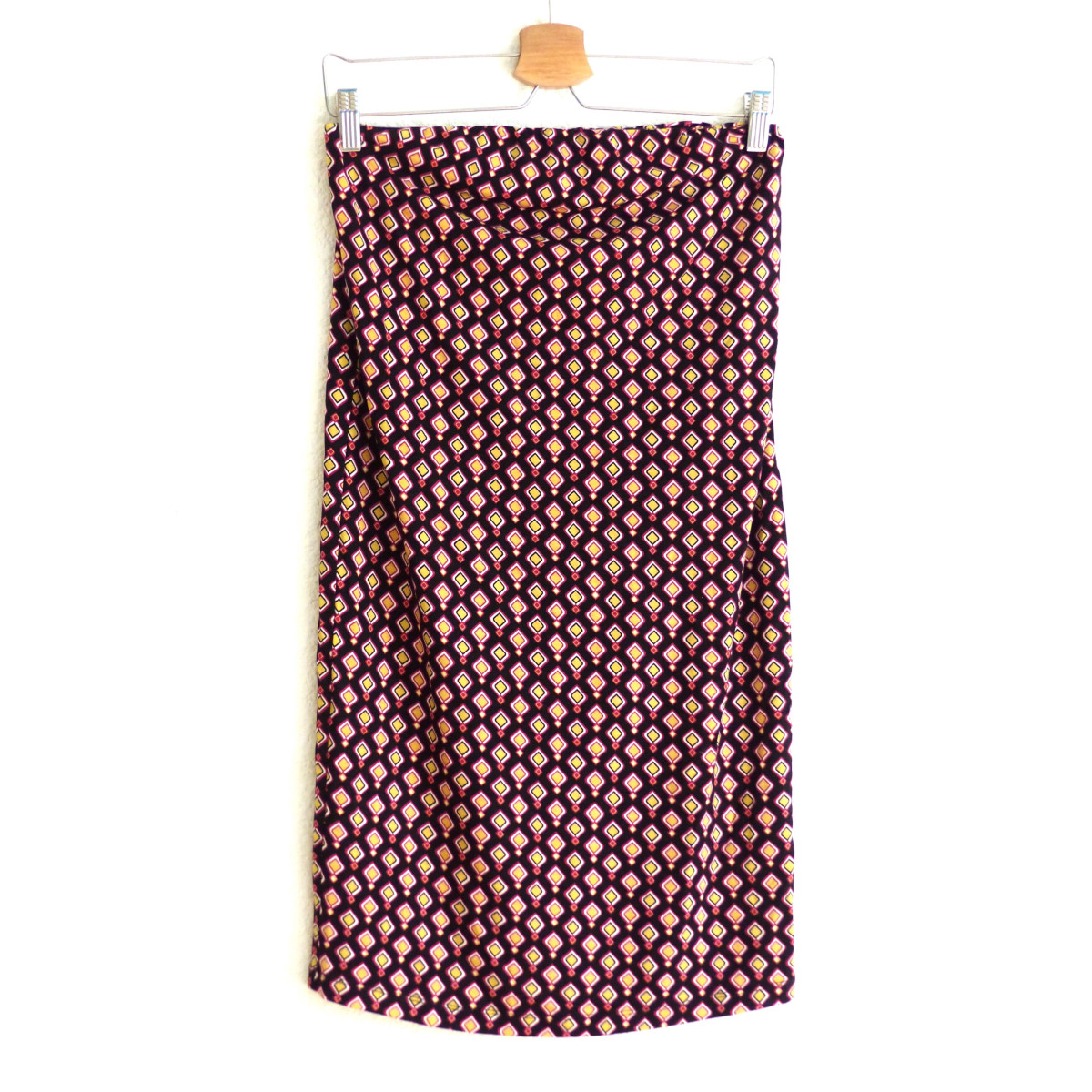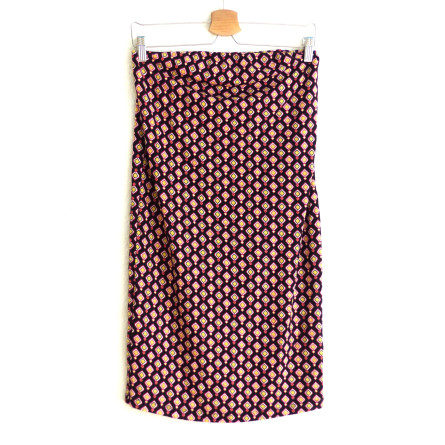 Une jupe confortable qui vous accompagnera tout au long de votre grossesse. De marque PRENATAL. Imprimé à l'inspiration seventies, couleur chocolat / moutarde et fushia.