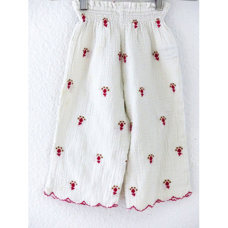 Pantalon en gaze de coton de marque ZARA en excellent état, imprimé fleuri brodé rouge sur fond couleur neige.