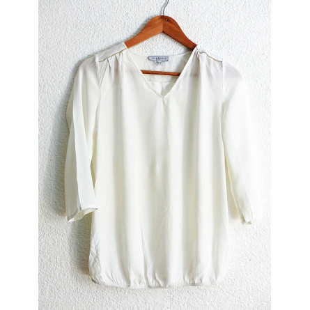 Blouse fluide et chic, couleur crème, ornée d'un liseré doré.