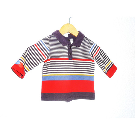 Polo en état neuf de marque CATIMINI: Couleur gris fumé, à rayures couleur crème, bleue et rouge. Fermeture par pressions dans le dos.