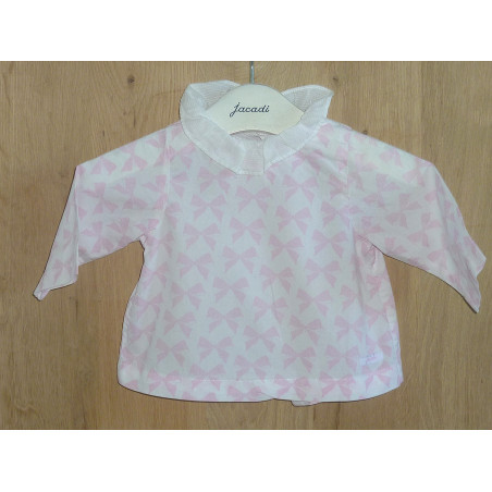 Blouse de marque JACADI en état excellent. Imprimé fleuri rose pastel sur fond blanc, ornée d'un petit col volanté.