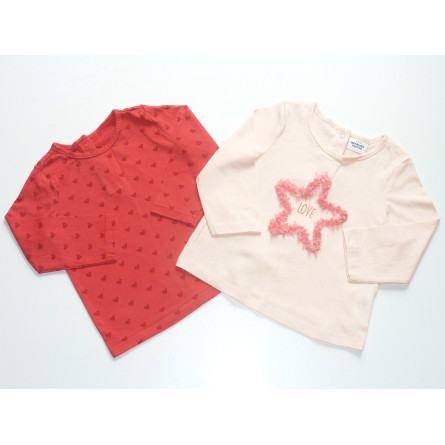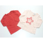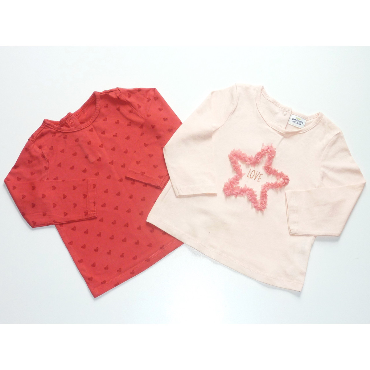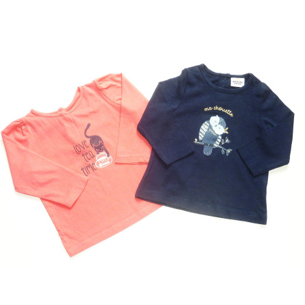 Lot de hauts de marque TAO, fermé par pressions dans le dos, un couleur marine, orné d'un motif ludique, l'autre rose orné d'un motif à relief. Etat excellent.