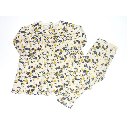 Ensemble en coton de marque PETIT BATEAU en très bon état, composé d'une robe et d'un legging, imprimé fleuri jaune et marine sur fond crème.