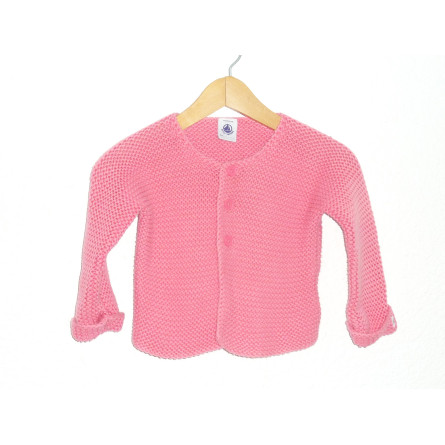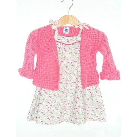 Robe de marque PETIT BATEAU, fermée par boutons dans le dos, imprimé fleuri rose et menthe sur fond crème associée au gilet rose PETIT BATEAU en coton tricoté en point de mousse. Etat excellent.