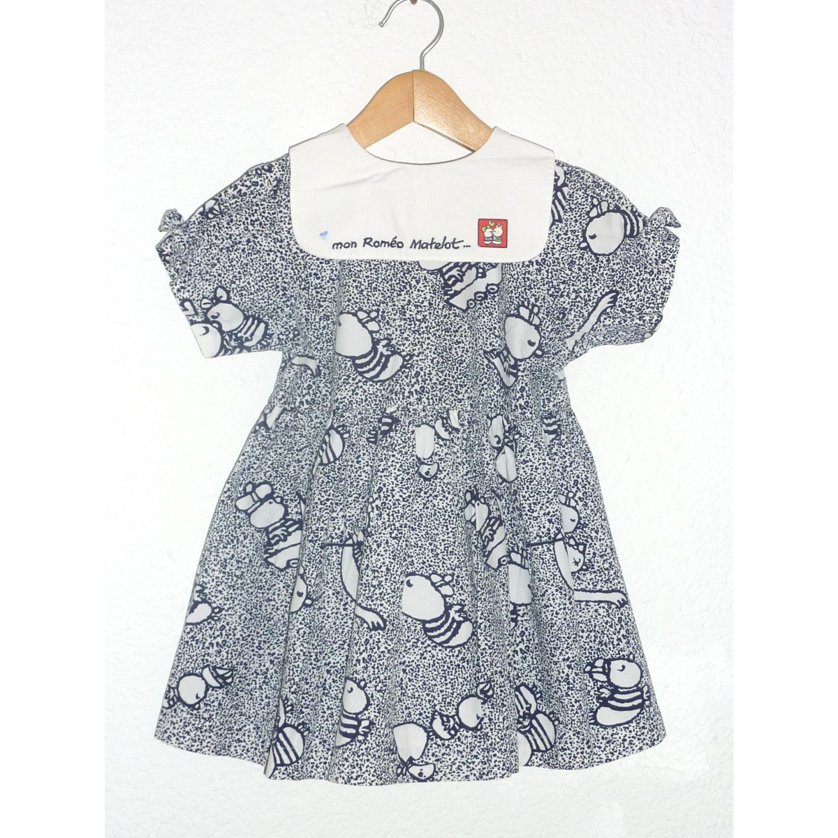 Robe vintage en excellent état, imprimé couleur crème sur fond marine, ornée d'un col marin retro chic.