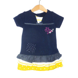 Tunique de marque COMPAGNIE DES PETITS en excellent état, bleue irisée et jaune, à volants, ornée de rayures, de pois et d'un motif irisé. Fermeture par pressions dans le dos.