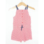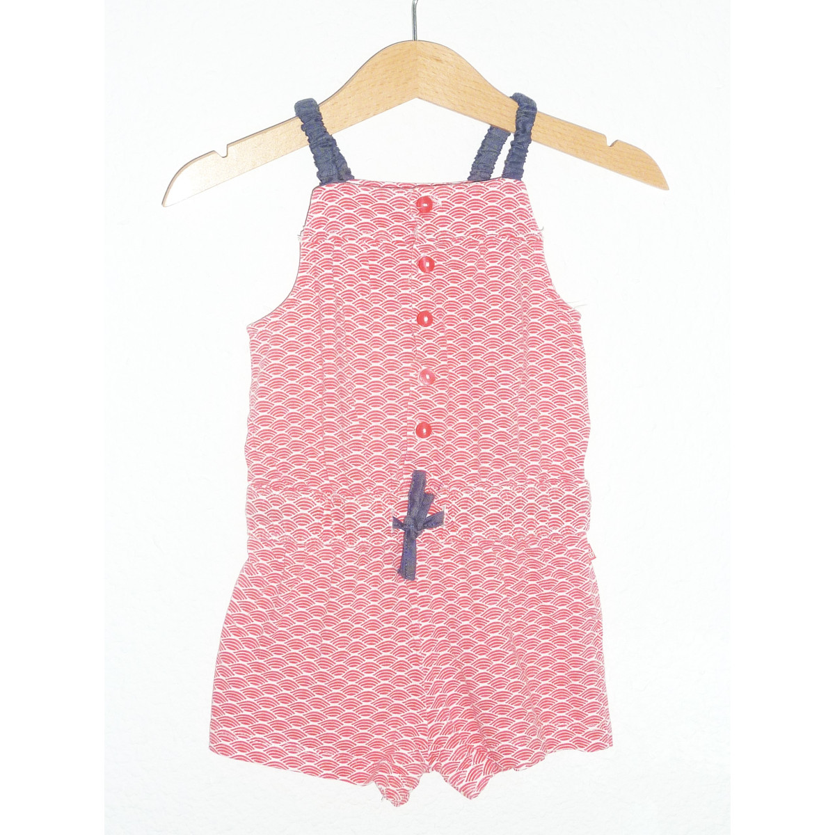 Salopette courte, légère, de marque OBAIBI, en excellent état. Imprimé rouge et bretelles couleur marine.
