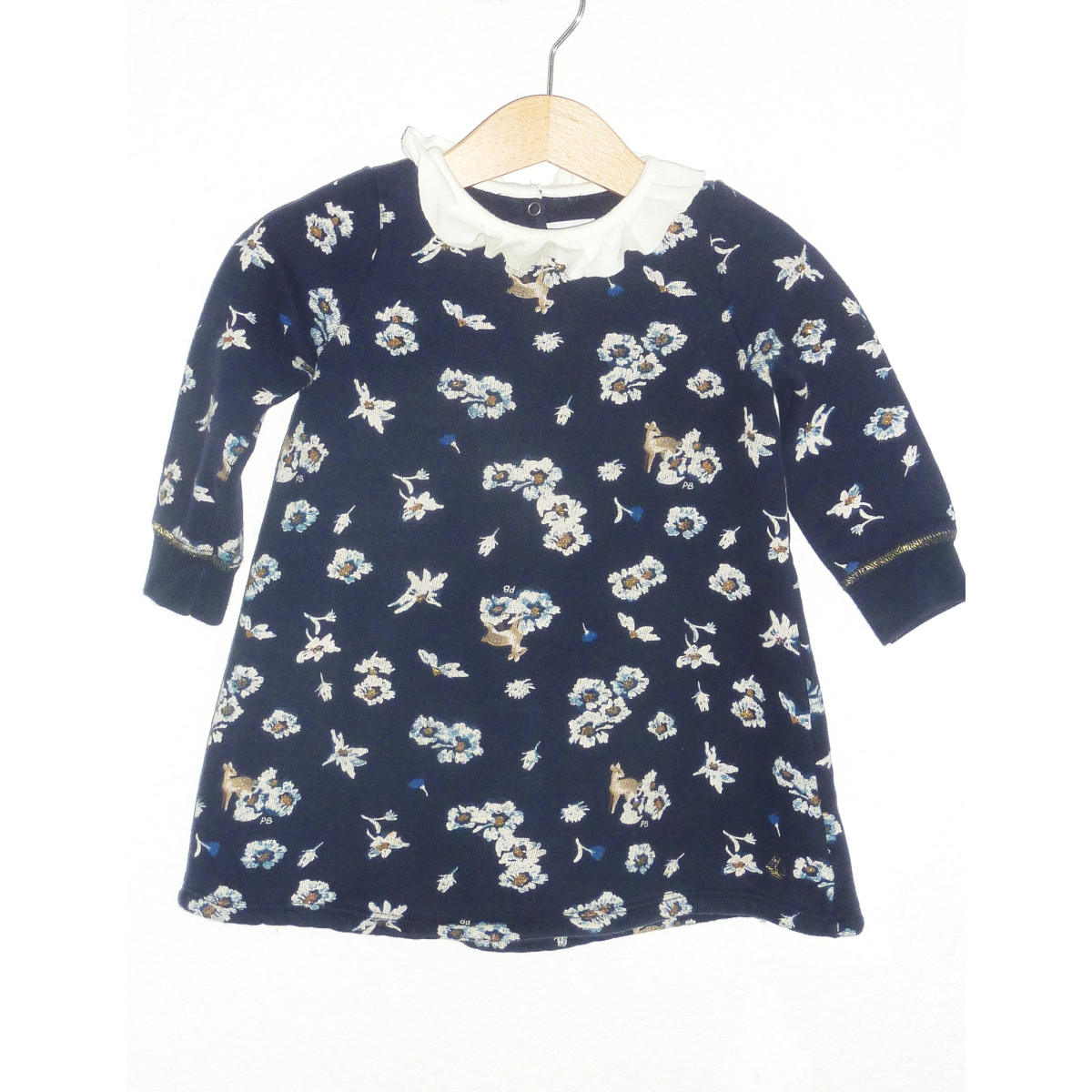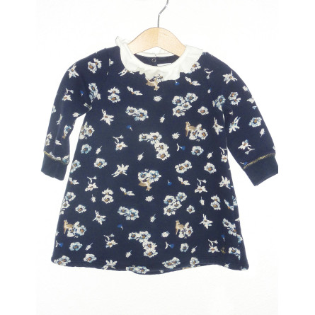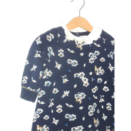 Robe en molleton de marque PETIT BATEAU, en état excellent. Imprimé fleuri crème et doré sur fond marine, ornée d'un petit col volanté.