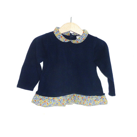 Pull de marque CYRILLUS, en état excellent. Couleur marine, en coton et angora. On aime son effet superposition avec son petit col et son volant imprimé liberty.