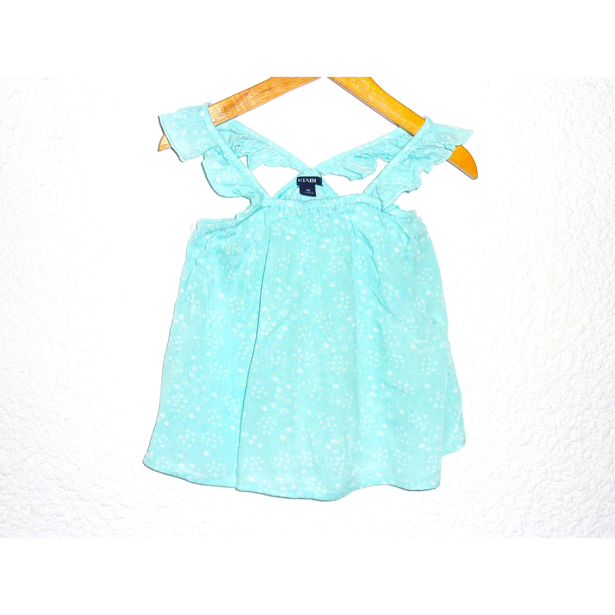 Top volanté de marque KIABI en excellent état, imprimé à pois blancs sur fond couleur mint.