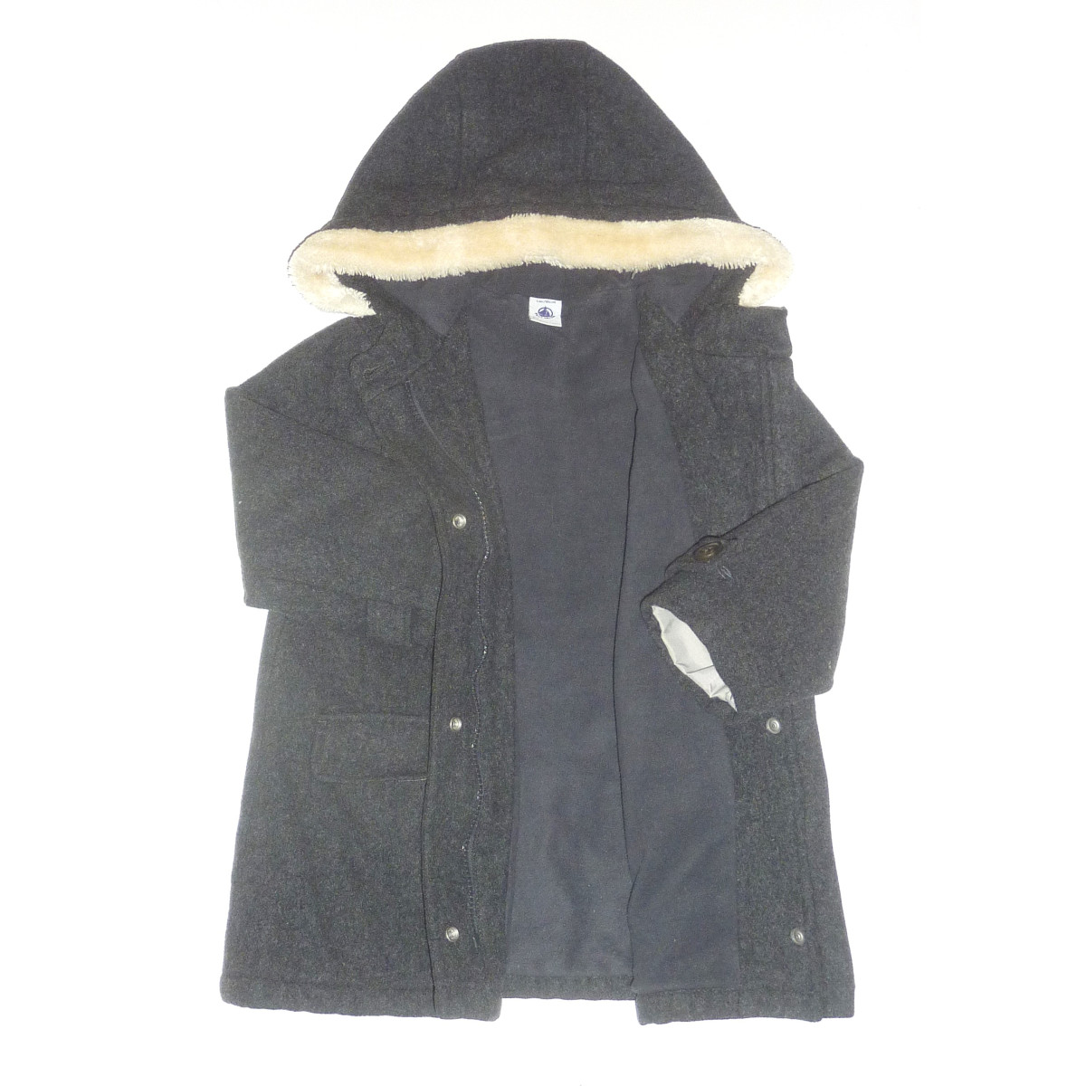 Manteau de marque PETIT BATEAU, en excellent état, doublé polaire, à capuche moutonnée, fermeture zippée, couleur gris fumé.