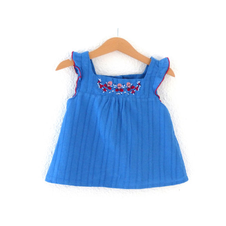 Top de marque SERGENT MAJOR en excellent état, bleu roi, orné de broderies rouges.