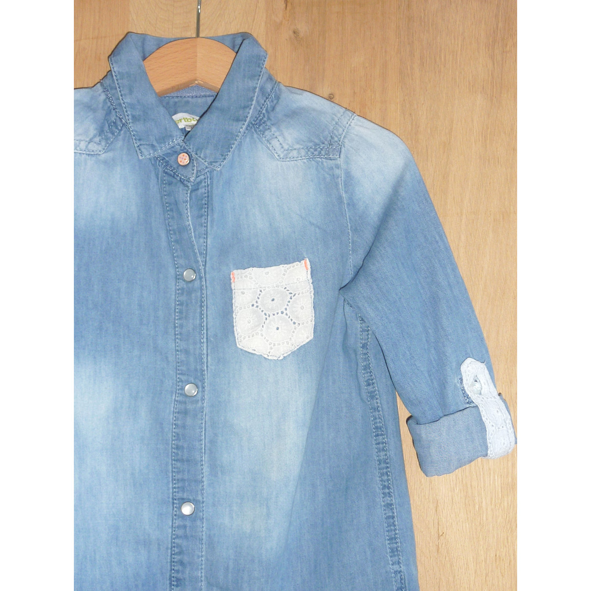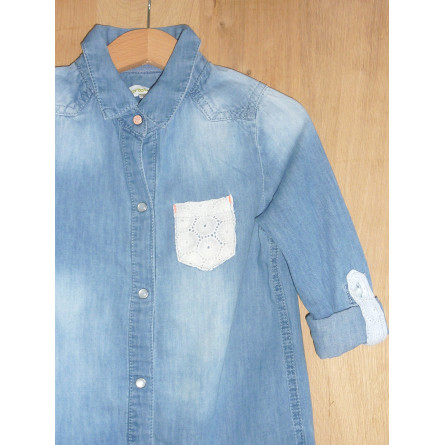 Chemise bleue denim, de marque VERT BAUDET en état excellent. Ornée d'une petite poche à dentelle.
