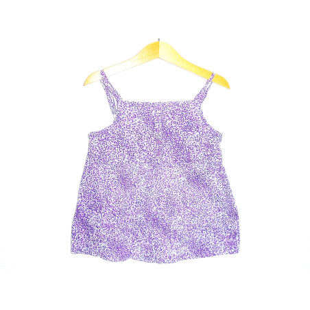 Tunique de marque MONOPRIX KIDS en excellent état, imprimé violet et parme à pois sur fond blanc.