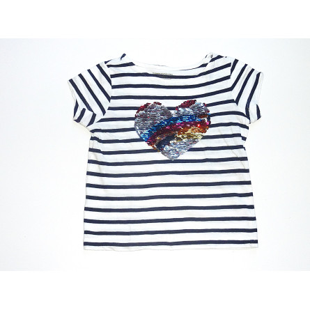 Tee Shirt de marque MONOPRIX Kids en excellent état. Rayures de couleur marine sur fond blanc, orné d'un coeur magique à sequins.