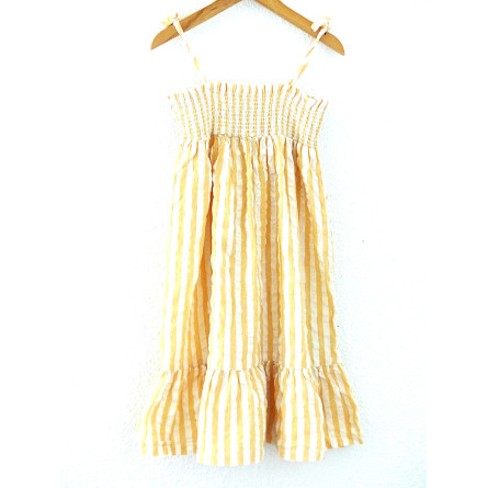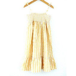 Robe de marque VERT BAUDET en état excellent, en tissu gaufré, rayures de couleur miel sur fond crème.