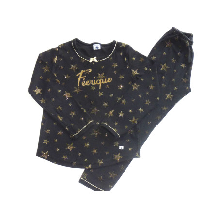 Pyjama de marque PETIT BATEAU, en très bon état, en coton. Imprimé doré sur fond couleur gris fumé. Un classique de la marque iconique Petit Bateau.