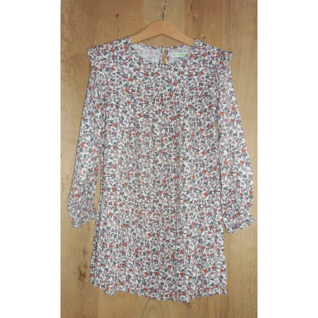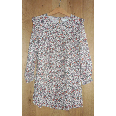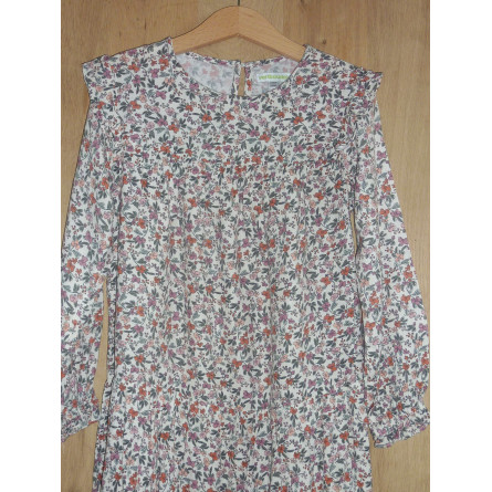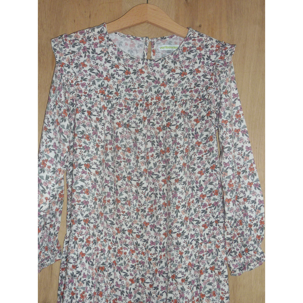 Robe de marque VERT BAUDET, en excellent état, en coton, imprimé fleuri couleur vert/cassis et abricot sur fond crème.