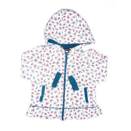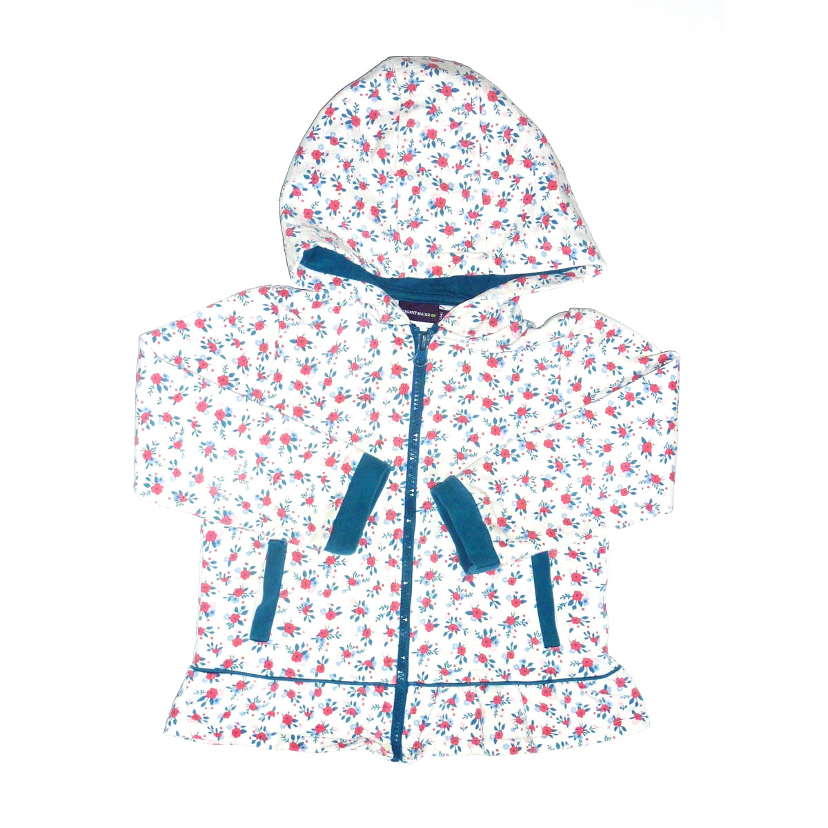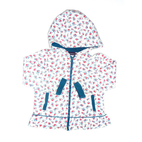 Sweat à capuche, de marque SERGENT MAJOR, en excellent état. Imprimé fleuri bleu et rose, sur fond blanc, fermeture zippée.