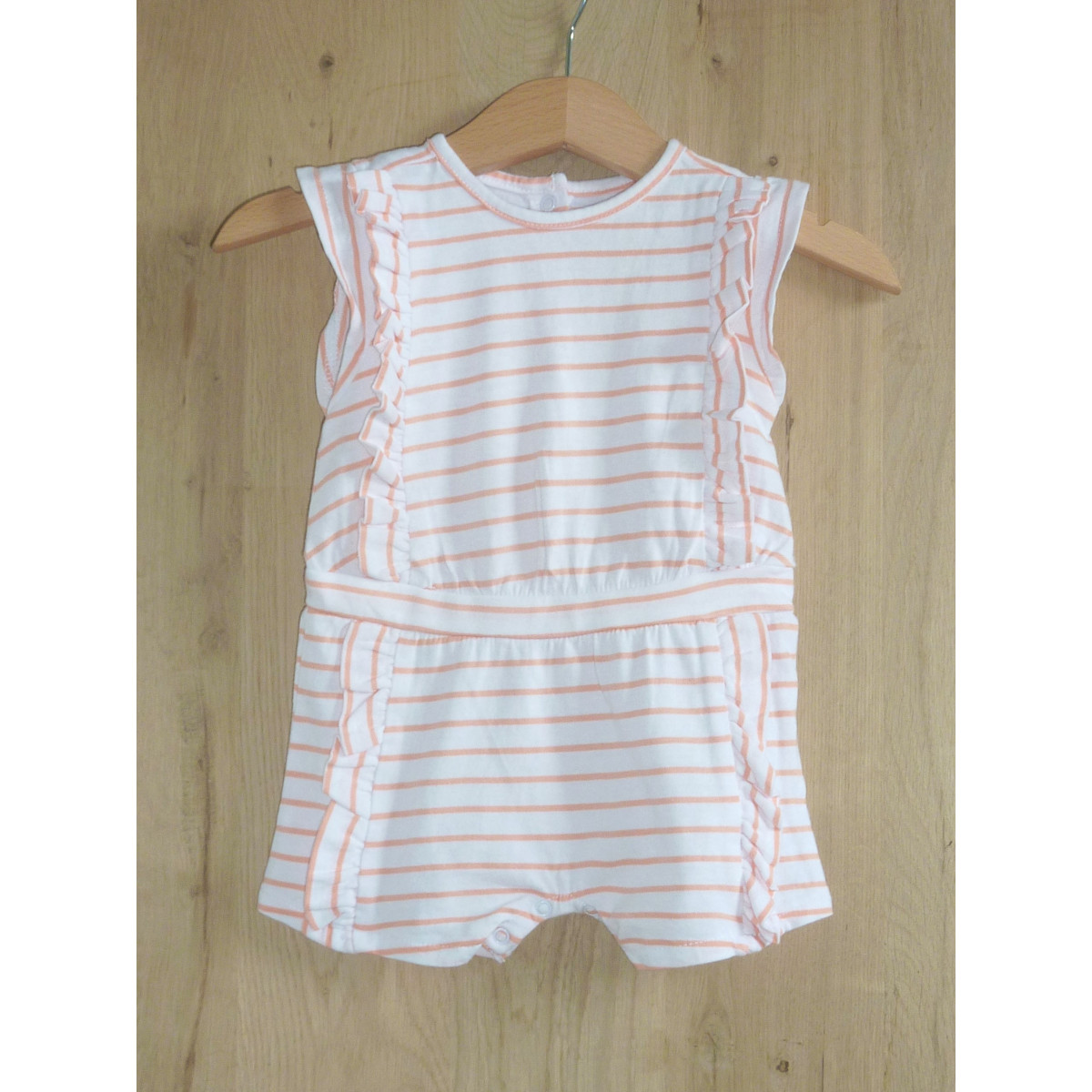 Combishort en excellent état, de marque VERT BAUDET, ornée de volants, blanche à rayures, couleur blush. L'indispensable pour la plage cet été !