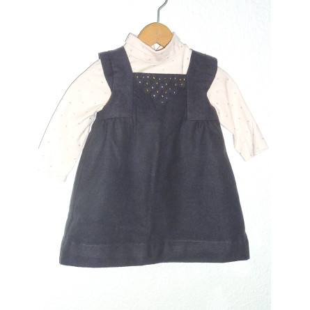 Ensemble de marque OBAIBI, en état excellent, composé d'une robe couleur grise, composée d'un peu de laine, coupe chic classique et du haut à col montant rose imprimé gris.