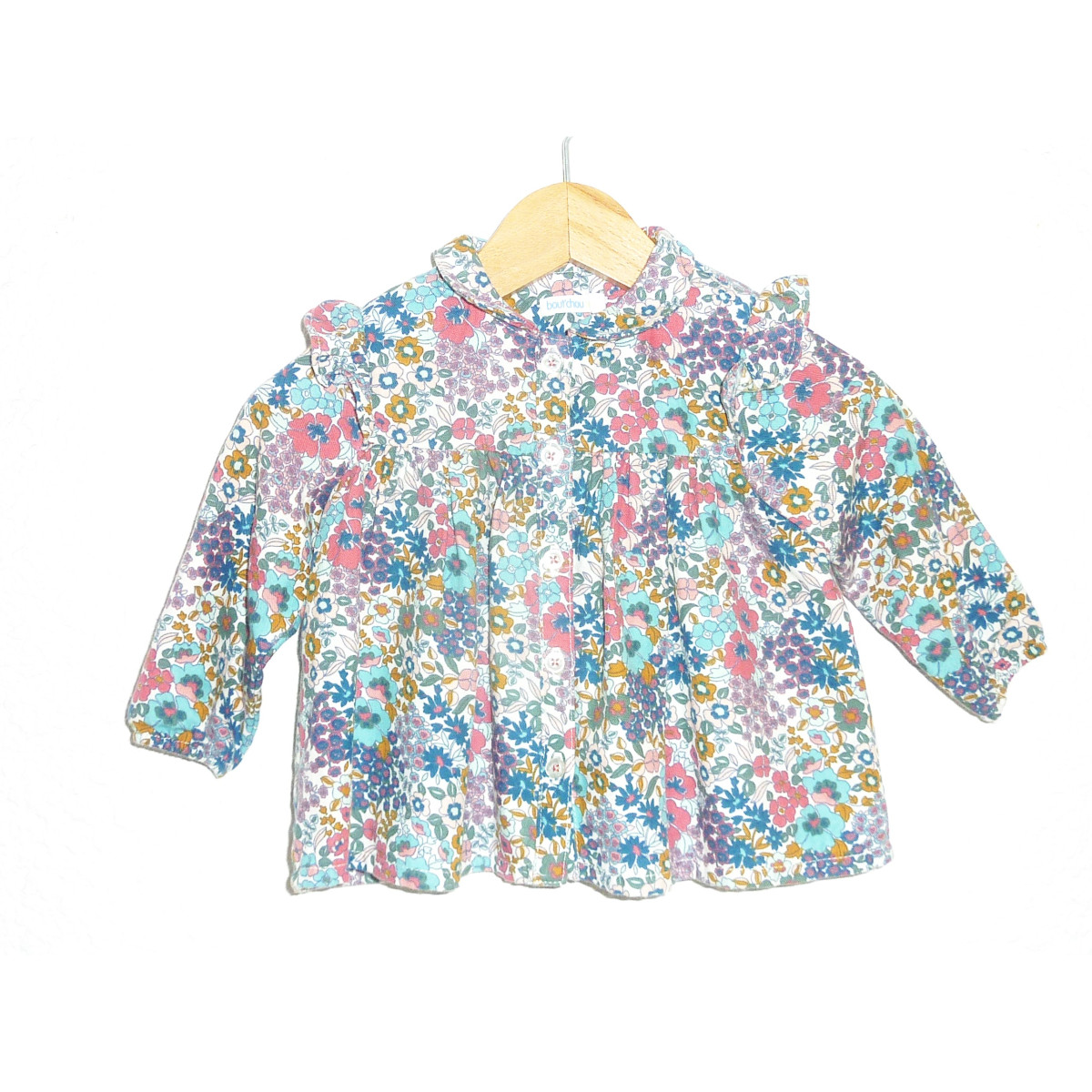 Coup de coeur pour ce splendide ensemble de marque BOUTCHOU composé d'une blouse imprimé fleuri multicolore, elle se pare d'un petit col. Fermeture boutonnée devant et du gilet moutonné crème. Etat excellent,
