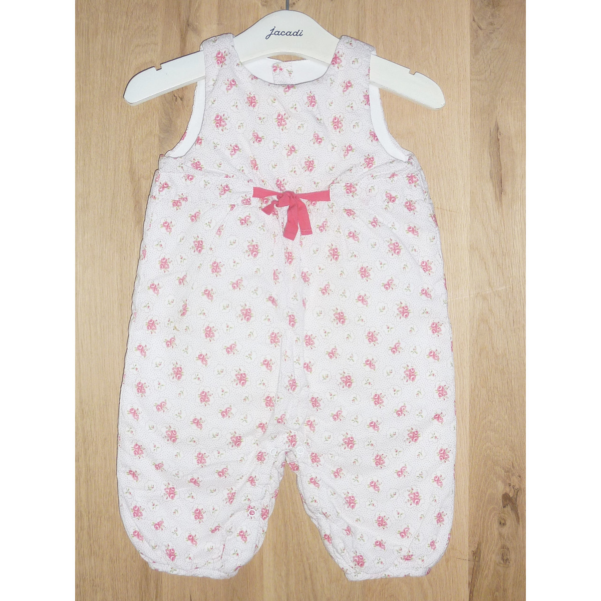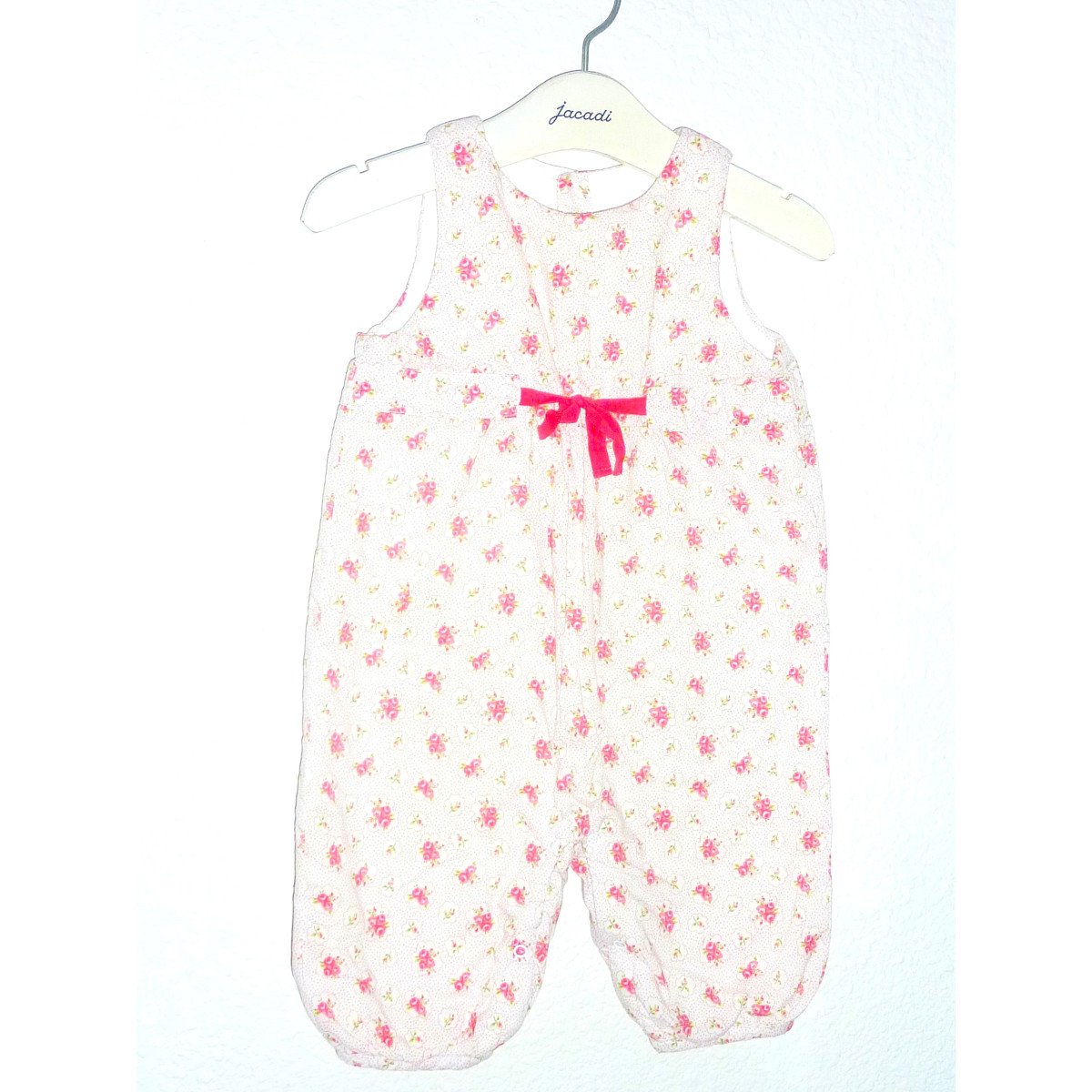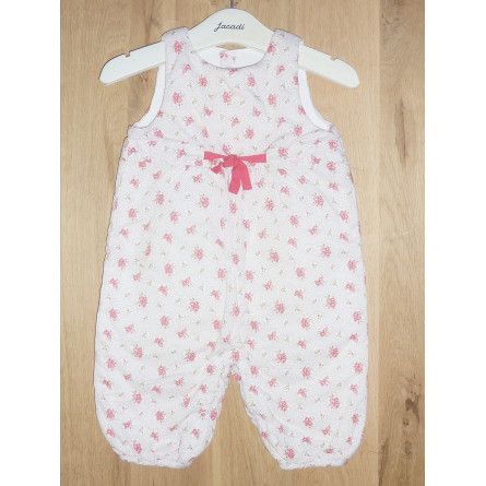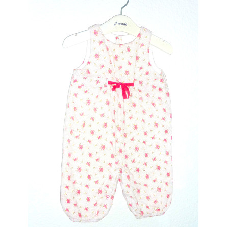 Salopette doublée en état neuf, de marque JACADI, imprimé fleuri de couleur rose soutenu, sur fond pastel, ornée d'un petit noeud.