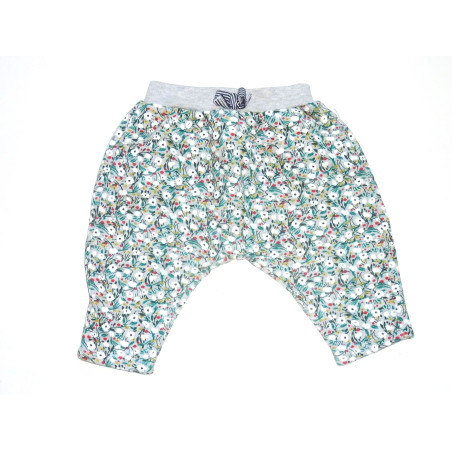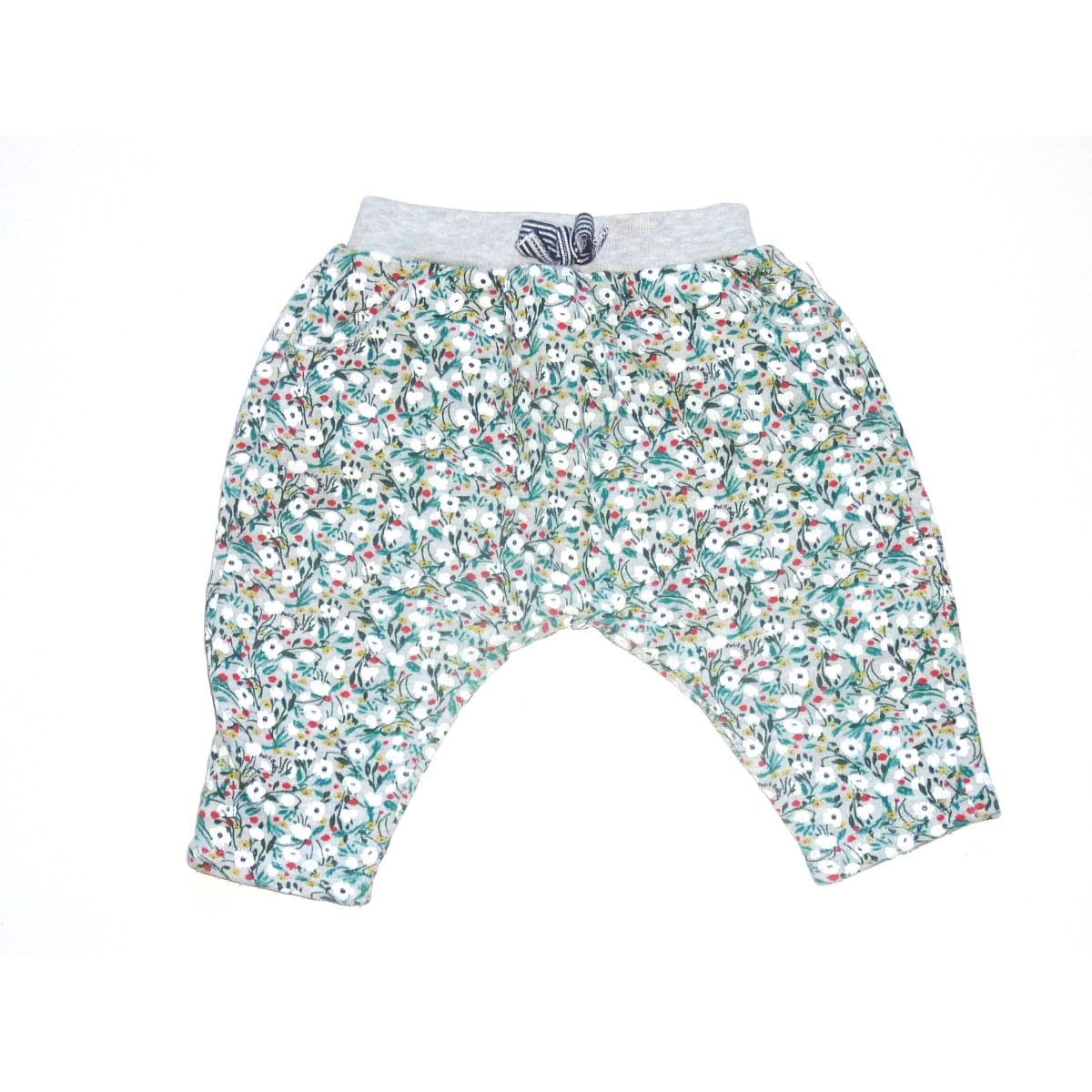 Sarouel en molleton, en état neuf, de marque PETIT BATEAU, imprimé vert et rouge sur fond crème. Ceinture élastique.
