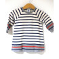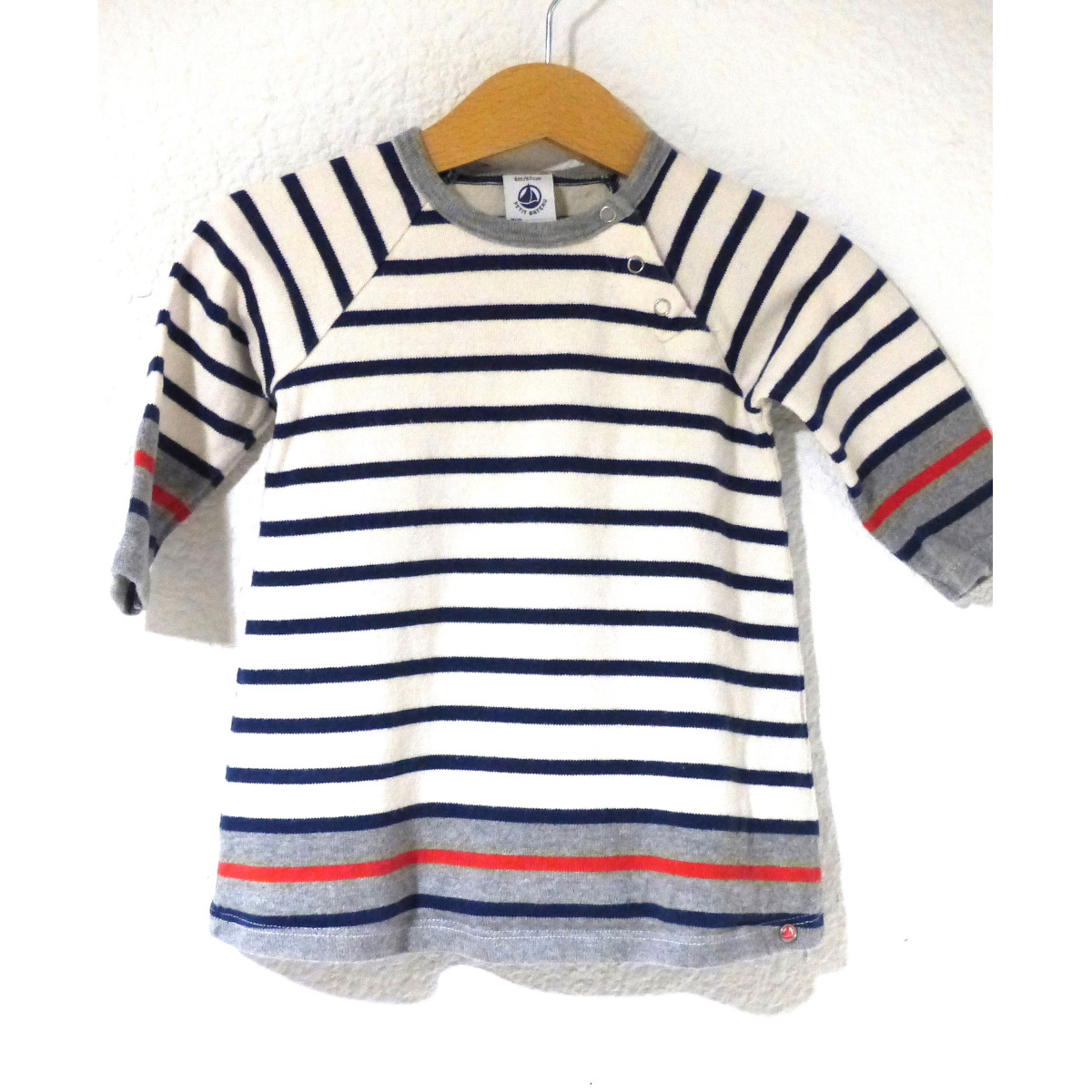 Robe pull, de marque PETIT BATEAU, en coton tricoté, rayures de couleur marine sur fond crème.