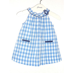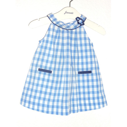 Robe en état neuf, de marque JACADI, imprimé à carreaux couleur bleue, ornée d'un petit noeud. Splendide.