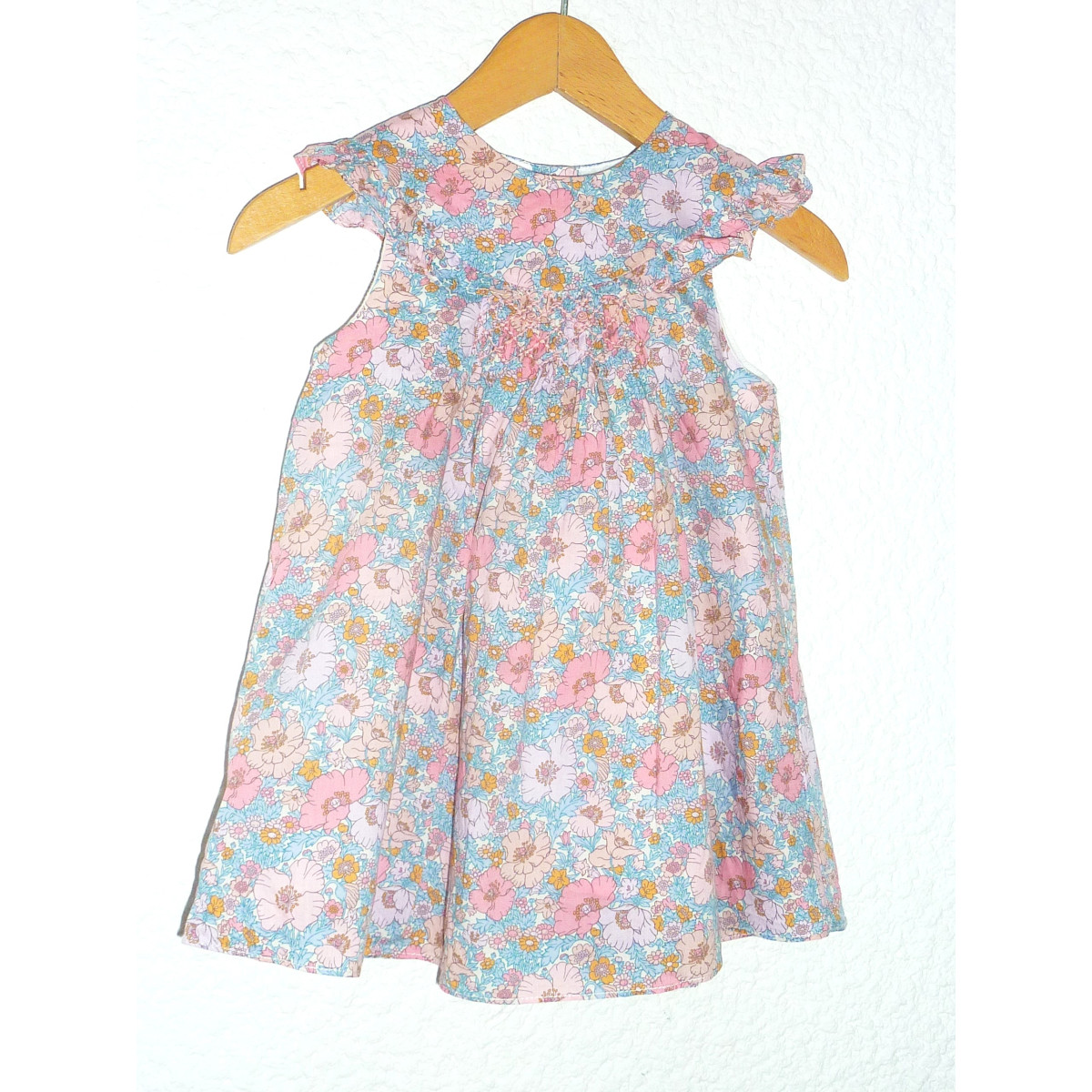 Robe neuve de marque CYRILLUS. Imprimé liberty fleuri couleur bleu, rose et parme. Magnifique, à smocks et manches volantées !