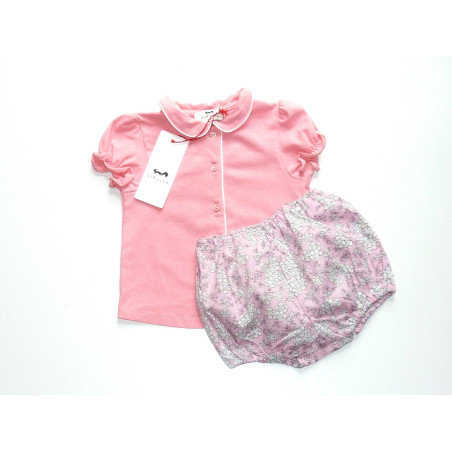 Ensemble composé du bloomer fleuri blanc sur imprimé rose poudré associé au polo neuf avec étiquette de marque CYRILLUS, rose buvard, boutonné devant.