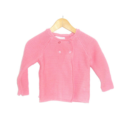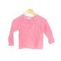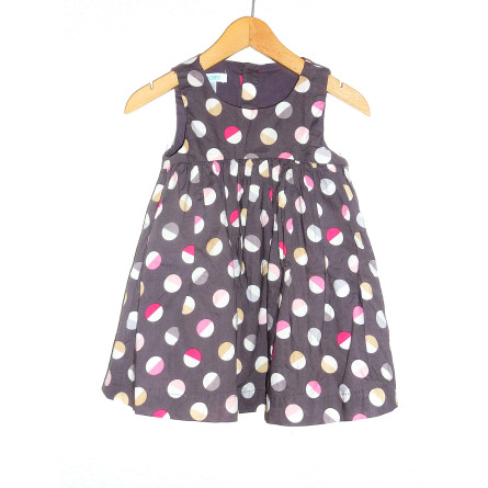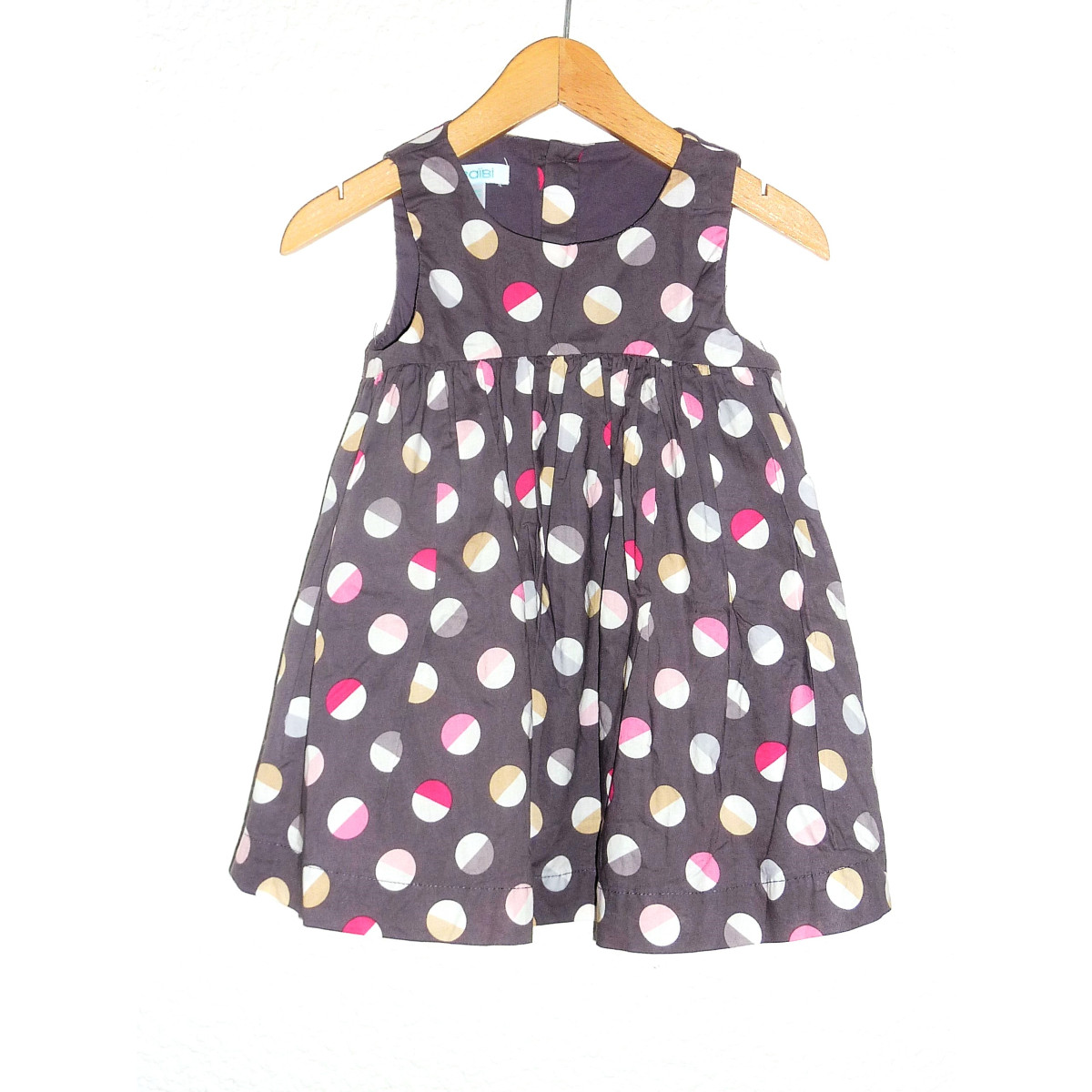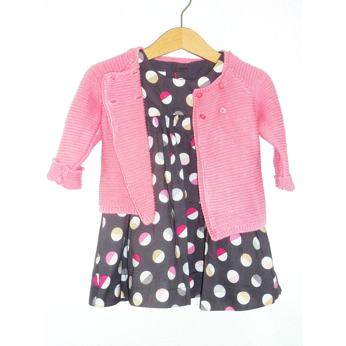 Etat excellent pour cet ensemble de marque OBAIBI composé d'une robe à pois rose sur fond couleur anthracite associée au gilet rose en coton tricoté.