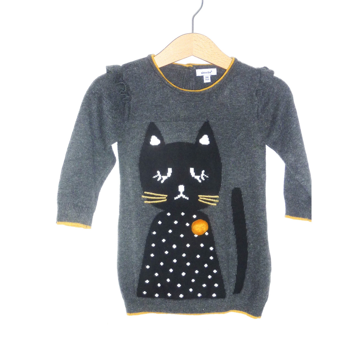 Robe pull de marque ABSORBA, en coton tricoté, couleur gris fumé, orné d'un chat noir et d'un liseré moutarde. Etat excellent.
