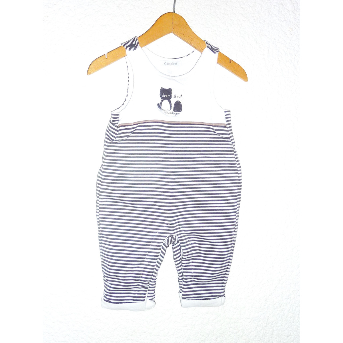 Combinaison en molleton de marque OBAIBI en excellent état, blanc orné de rayures couleur gris fumé et d'une broderie.