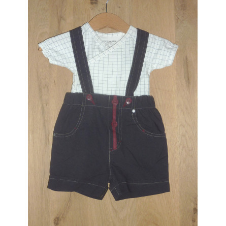 Ensemble en excellent état composé d'un short vintage à bretelles et associé au body de marque VERT BAUDET, imprimé chic à carreaux bleus sur fond blanc.