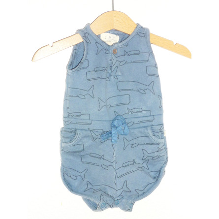 Barboteuse de marque éthique LES PETITES CHOSES en état excellent, imprimé animalier noir sur fond bleu grisé.