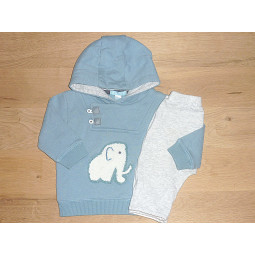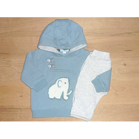 Ensemble de marque OBAIBI en parfait état composé d'un sarouel en molleton, gris chiné, ceinture élastique (3 mois) associé au sweat à capuche bleu (6 mois).