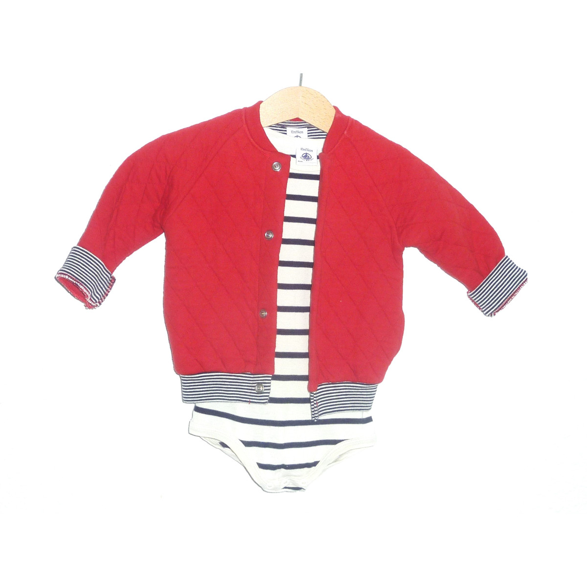 Ensemble de marque PETIT BATEAU en excellent état, composé d'un body crème et marine rayé, associé au sweat en molleton rouge, ornée de rayures couleur marine et crème, fermeture par pressions.