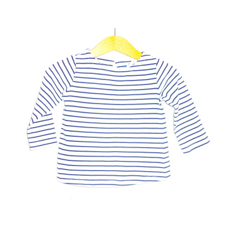 Marinière de marque BOUTCHOU en état excellent. Rayures de couleur marine sur fond blanc.