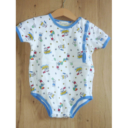 Barboteuse vintage en état excellent. Imprimé ludique sur fond crème, ornée d'un liseré bleu.
