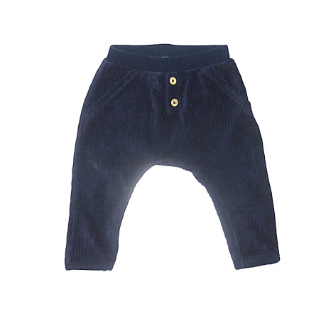 Sarouel KIABI en état excellent, en velours côtelé lisse, couleur bleue nuit, ceinture élastique. Le petit plus ? Son look mixte.
