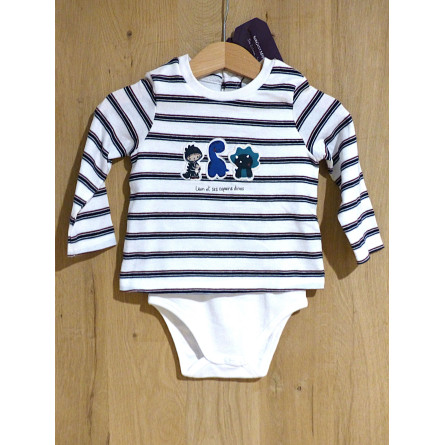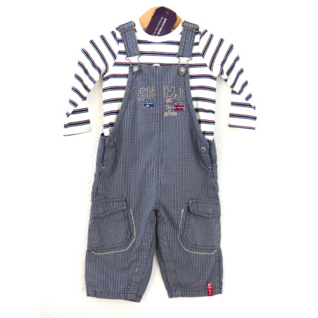 Ensemble de marque SERGENT MAJOR, composé d'un body neuf avec étiquette, haut intégré, rayé et orné d'un petit motif, associé à la salopette grise à carreaux en parfait état.